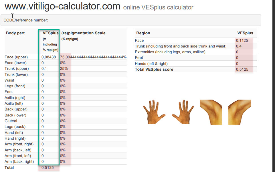 The Vitiligo-Calculator team has addressed an issue with the export of the selected VESplus scores to a PDF (summary of the selected scores), where 'total score', 'percentage repigmentation', and the 'Region' table values were not displaying the integrated VES values including the percentage of repigmentation. Despite this, the detailed VESplus values (of each area separately) were accurately presented. The team has rectified the problem and assures improved performance moving forward. They express their apologies for any inconvenience caused and commit to higher standards in the future.
