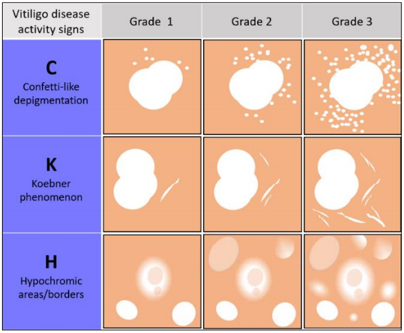 | Confetti-like depigmentations | Koebner Phenomenon | Hypochromic areas/borders |